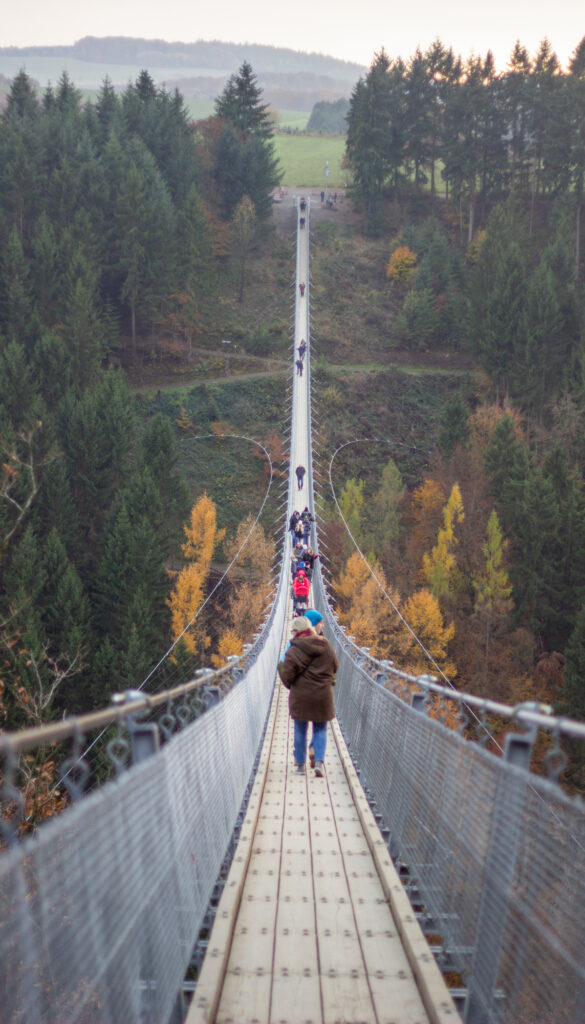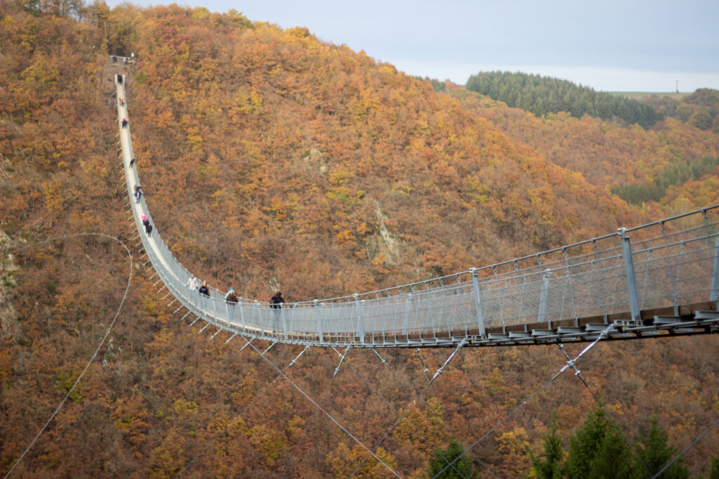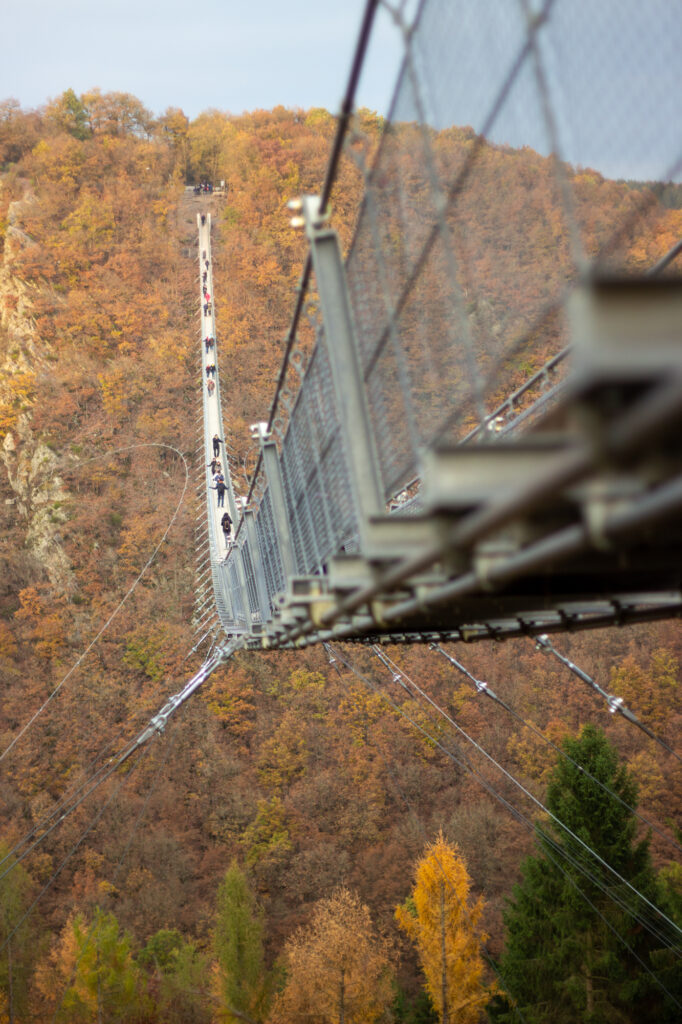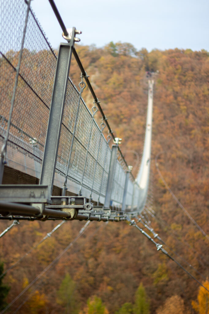 The Geierlay is a suspension bridge in the low mountain range of the Hunsrück in western Germany. It was opened in 2015. It has a span range of 360 metres (1,180 ft) and is up to 100 metres (330 ft) above ground. On both sides of the bridge are the villages of Mörsdorf and Sosberg. A stream named Mörsdorfer Bach runs through the valley below the bridge. The nearest city is Kastellaun 8 km eastwards. The state capital Mainz is 66 km towards east.