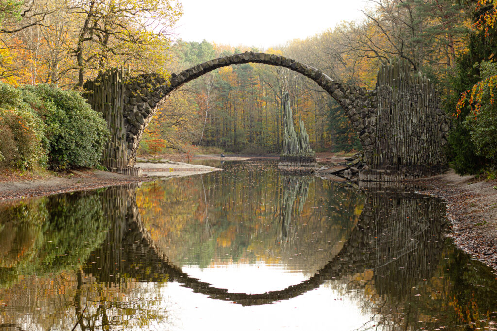 Commissioned in 1860 by the knight of the local town, the thin arch stretching over the waters of the Rakotzsee is roughly built out of varied local stone. Like many similarly precarious spans across Europe, the Rakotzbrücke is known as a “devil’s bridge,” due to the colloquialism that such bridges were so dangerous or miraculous that they must have been built by Satan. While the bridge was created by mortal hands, its builders did seem to hold the aesthetics of the bridge in higher regard than its utility.
